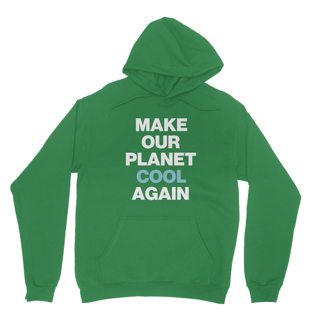 Make Our Planet Cool Again Organic Hoodie, a super soft, sustainable garment made from 100% cotton. This hoodie is for all the climate warriors out there. Stop the heat. Let’s all cool down. Make our planet cool again. Wear your “Make Our Planet Cool Again” item and help take action to stop climate change.